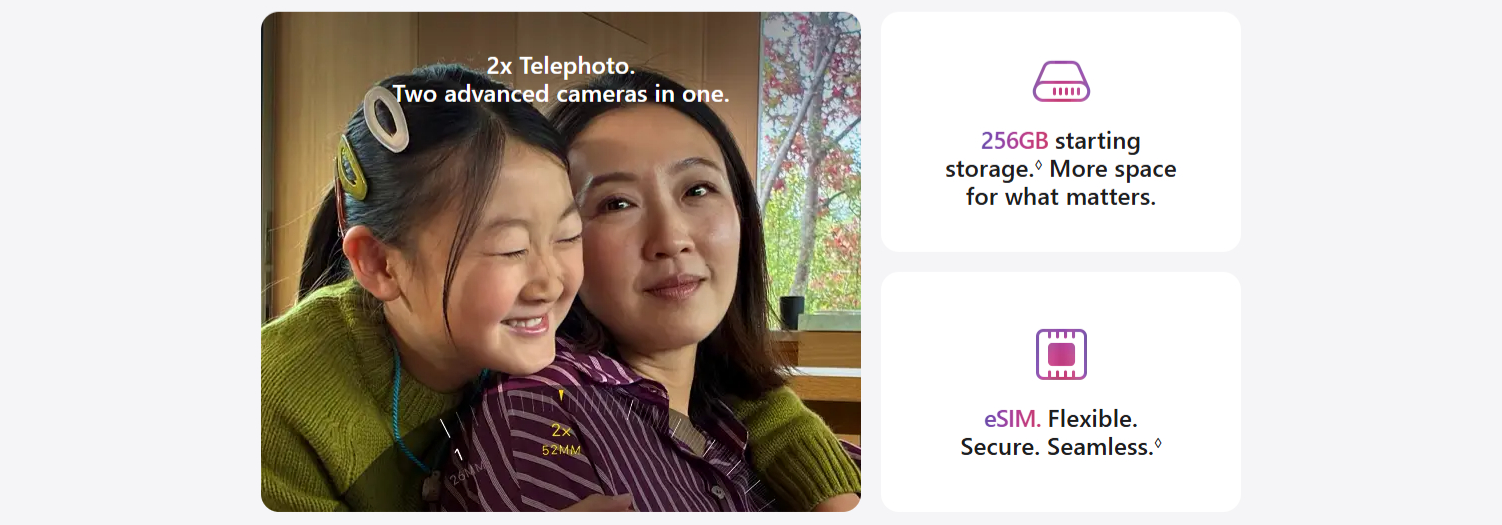 | Front Camera : 12MP TrueDepth camera ƒ/1.9 aperture 4K Dolby Vision video recording at 24 fps, 25 fps, 30 fps or 60 fps 1080p Dolby Vision video recording at 25 fps, 30 fps or 60 fps Rear Camera : 48MP Fusion Main: 26 mm, ƒ/1.6 aperture, optical image stabilization, Hybrid Focus Pixels, super-high-resolution photos (24MP and 48MP) Enables 12MP 2x Telephoto: 52 mm, ƒ/1.6 aperture |